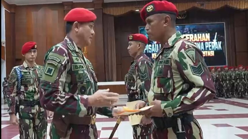 JAKARTA – Panglima Komando Pasukan Khusus (Kopassus) Letnan Jenderal TNI Djon Afriandi memimpin langsung upacara penganugerahan Sangkur Perak, penghargaan kehormatan tertinggi di lingkungan Korps Baret Merah, kepada sejumlah prajurit berprestasi luar biasa. Penghargaan ini diberikan sebagai bentuk apresiasi atas dedikasi, keberanian, dan pengabdian yang melampaui panggilan tugas demi kejayaan satuan dan bangsa.