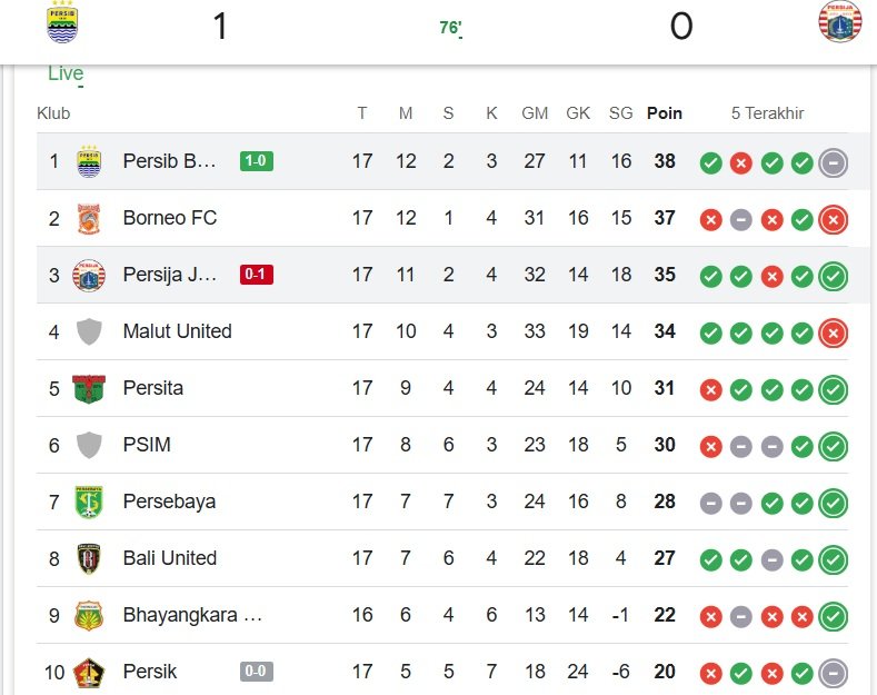 Dengan hasil ini, Persib kini memimpin klasemen dengan keunggulan tipis atas pesaing terdekatnya. Laga El Clasico Indonesia ini menjadi momentum penting bagi Maung Bandung untuk menjaga konsistensi menuju putaran kedua kompetisi. Bobotoh pun merayakan kemenangan ini dengan penuh semangat.