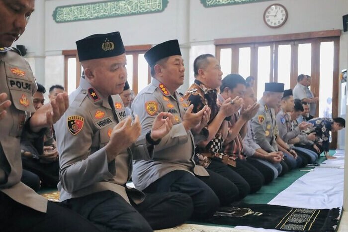 Prosesi ibadah berlangsung di Masjid Baiturrahman, Mapolda Banten, pada Jumat (29/8) usai sholat Jumat berjamaah, diikuti oleh Kapolda, pejabat utama, hingga personel kepolisian.