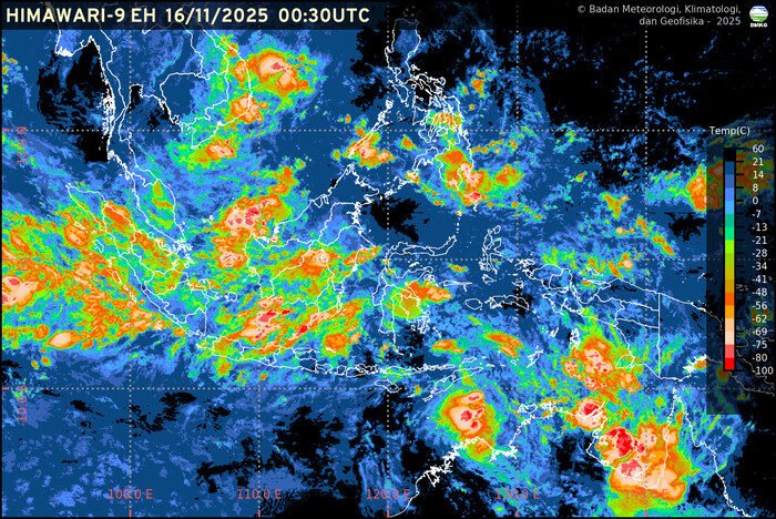 Berikut ini informasi prakiraan cuaca nasional oleh Badan Meteorologi Klimatologi dan Geofisika (BMKG), Minggu (16/11/2025):