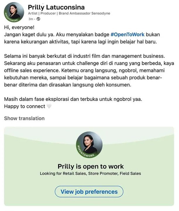 “Hi everyone! Jangan kaget dulu, ya. Aku menyalakan badge #OpenToWork bukan karena kekurangan aktivitas, tapi karena lagi ingin belajar hal baru,” ujar Prilly, Senin (26/1/2026).