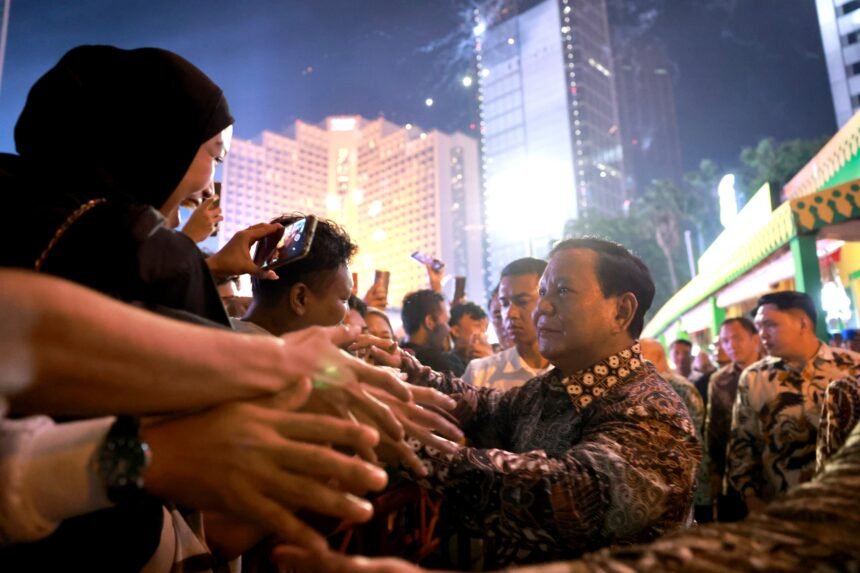 JAKARTA – Presiden RI Prabowo Subianto disambut meriah oleh ribuan warga yang memadati kawasan Bundaran Hotel Indonesia (HI), Jakarta Pusat, pada malam pergantian tahun, Selasa (31/12).
