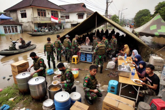 BEKASI – Dalam upaya tanggap darurat terhadap banjir besar yang melanda Bekasi, jajaran TNI Angkatan Darat melalui Batalyon Infanteri (Yonif) 202/Tajimalela mengerahkan pasukan untuk membangun dapur darurat serta mengevakuasi warga terdampak.